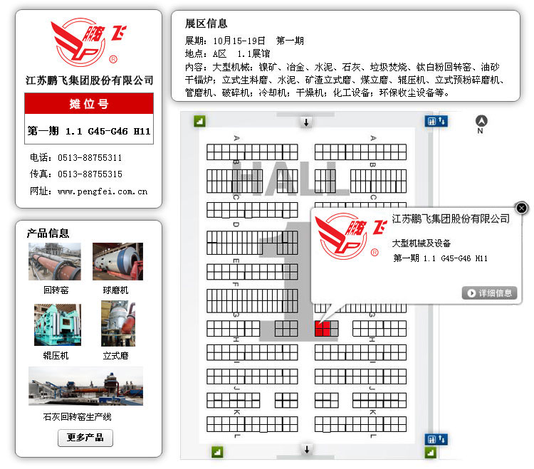 江蘇鵬飛集團在廣交會上精心布置展位,印發(fā)各類設備的介紹手冊,整體模型展示水泥生產線產品,委派具有多年工作經驗的銷售、技術、售后等專業(yè)工作人員為顧客詳細介紹新產品、新技術,全面分析解答各類設備從購買到投產使用以及售后服務等每個環(huán)節(jié)的問題,為您排疑解難,與您達成共識。同時,也希望能和更多的國內外公司加強聯(lián)系,互相合作,為客戶提供更加完美的產品。