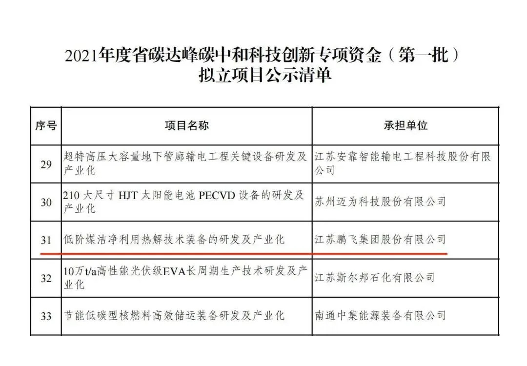 近日,江蘇省科技廳發(fā)布《2021年度省碳達(dá)峰碳中和科技創(chuàng)新專項(xiàng)資金(第一批)擬立項(xiàng)目公示》。座落于江蘇海安的鵬飛集團(tuán)股份有限公司的“低階煤潔凈利用熱解技術(shù)裝備的研發(fā)及產(chǎn)業(yè)化”項(xiàng)目獲立項(xiàng)公示。利用回轉(zhuǎn)窯熱解技術(shù)進(jìn)行低階煤提質(zhì)清潔利用屬國(guó)內(nèi)首創(chuàng),項(xiàng)目已獲授權(quán)發(fā)明ZL10件、實(shí)用新型ZL9件。