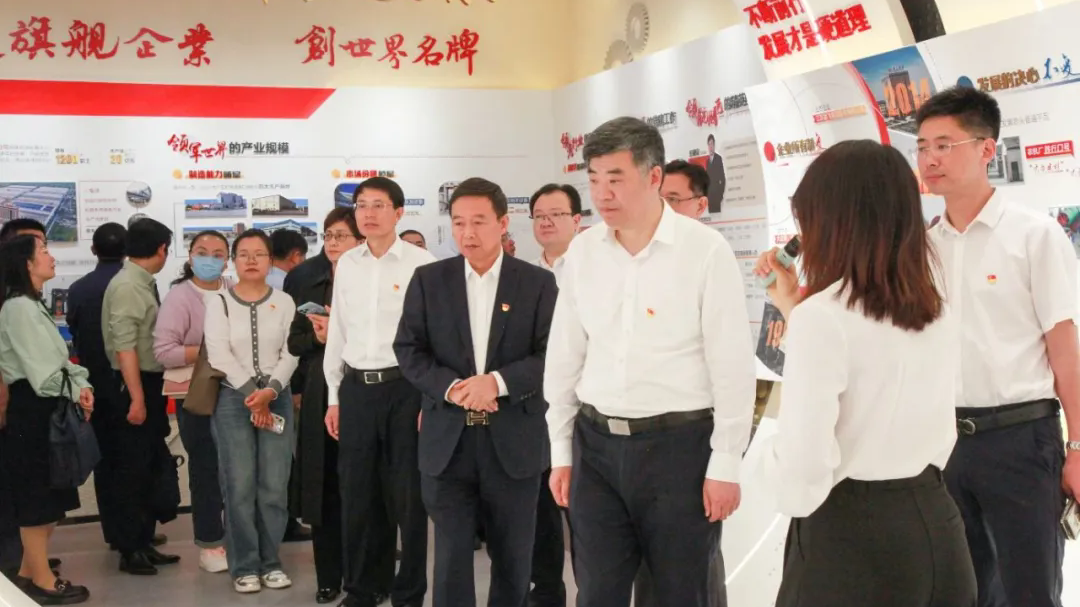 南通市委書記吳新明、海安市委書記譚真參觀鵬飛展示中心,董事長(zhǎng)王家安向其介紹產(chǎn)品研發(fā)、生產(chǎn)銷售、國(guó)外市場(chǎng)拓展情況