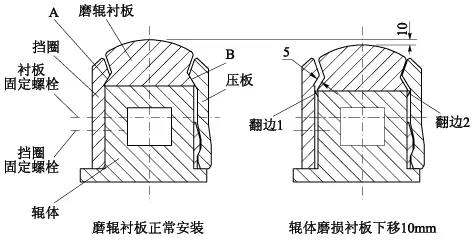 利用庫(kù)滿停機(jī)檢查,發(fā)現(xiàn)有一塊磨輥襯板的2條固定螺栓松動(dòng),緊固螺栓后用撬杠仍可以撬動(dòng)襯板。此時(shí)分析認(rèn)為可能是這塊襯板與輥體接觸面處出現(xiàn)較大磨損、變形,襯板固定不牢固。用塞尺測(cè)量接觸面A、B處間隙,B處接觸面符合要求,A處有5mm間隙。拆開(kāi)襯板后發(fā)現(xiàn),該襯板下面的輥體磨去10mm左右,輥體在靠擋圈側(cè)及壓板側(cè)分別形成寬約5mm及25mm的翻邊(見(jiàn)圖1中翻邊1及翻邊2)。其他11塊襯板及對(duì)應(yīng)的輥體正常。由上述檢查可知,輥體表面的磨損及翻邊造成了襯板固定不牢固。