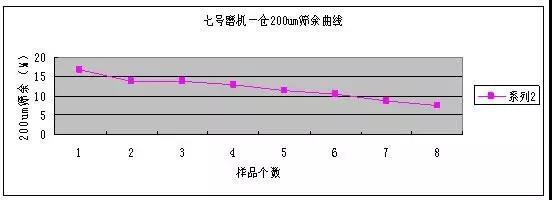 (1)從以上的兩個(gè)趨勢圖可以看出七號磨機(jī)的一倉粉磨能力還可以,特別是200um的篩余趨勢圖,篩余下降明顯。說明一倉鋼球級配和理粉磨能力正常。