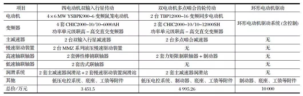 表 2 φ12.2 m×8.8 m 半自磨機驅(qū)動方案配置及造價對比