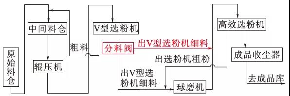 圖3 兩路分料閥3 試驗步驟(1)在設(shè)備運行穩(wěn)定、產(chǎn)質(zhì)量正常情況下,出V型選粉機(jī)微粉全部入磨機(jī),即以聯(lián)合粉磨方式為基準(zhǔn),簡稱為試驗1;