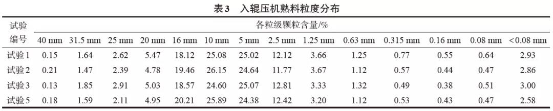 4 試驗數(shù)據(jù)的比較和說明4.1 試驗過程中輥壓機(jī)物料顆粒組成變化