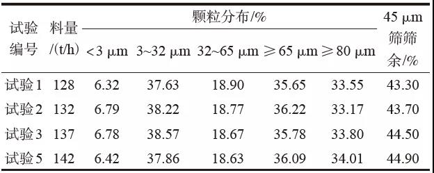 從表3和表4比較可知,四種試驗運行情況下,試驗原始物料配比不變,熟料粒度差別不大的情況下,隨著投料量的增加,出V型選粉機(jī)微粉總體變粗。