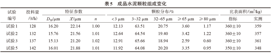 關(guān)閉和開啟不同格數(shù)的分料閥進(jìn)行生產(chǎn),分別標(biāo)定磨機(jī)產(chǎn)量,并對粉磨過程中各點物料進(jìn)行取樣,測定物料顆粒組成及物理性能、與外加劑相容性。然后對加工過程中各點物料粒度變化情況進(jìn)行比較后進(jìn)行質(zhì)量指標(biāo)的調(diào)整(試驗5)。