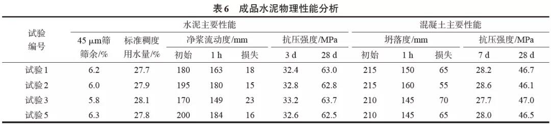 成品水泥顆粒組成變化分析見表5,成品水泥物理性能變化見表6。其中,(1)水泥凈漿流動度和混凝土坍落度試驗中減水劑均使用JY公司生產(chǎn)的PS-1型聚羧酸減水劑;(2)水泥凈漿流動度試驗依照GB/T 8077—2012《混凝土外加劑勻質(zhì)性試驗方法》進(jìn)行,減水劑摻入量為水泥質(zhì)量的0.8%;(3)混凝土強(qiáng)度等級為C30,依照J(rèn)GJ 55—2011《普通混凝土配合比設(shè)計規(guī)程》進(jìn)行的相同配合比設(shè)計,減水劑摻入量為膠凝材料質(zhì)量(水泥、粉煤灰和礦粉)的2.0%,膠凝材料和骨料均為同一進(jìn)廠批次,坍落度試驗依照GB/T 50080—2016《普通混凝土拌合物性能試驗方法標(biāo)準(zhǔn)》進(jìn)行。