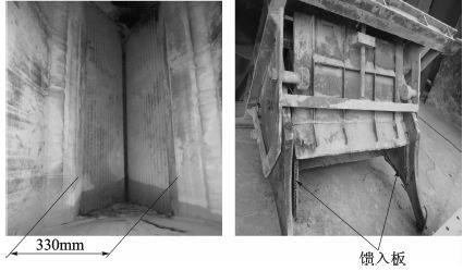 2)輥壓機喂料裝置通過口太小,只有1500mm×280mm,不能滿足過飽和喂料要求。兩側(cè)饋入板磨損嚴重,存在邊緣效應。