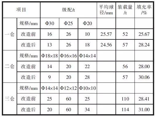 6)磨機研磨體用振動篩嚴格篩撿,淘汰不合格研磨體;人工清理隔倉板篦縫,保證磨內(nèi)每條篦縫暢通,要求達到“料走篦縫,風走通風圓”,避免調(diào)風時細度跑粗或磨頭冒正壓。清理檢修后,磨主機電流由345~350A上升到355~360A,磨尾壓力由-600~-800Pa降低到-400~-600Pa。7)調(diào)整磨內(nèi)研磨體級配,提高磨機各倉填充率,降低平均球徑,增大研磨面積,從而降低物料流速,提高出磨水泥比表面積。改造前后磨內(nèi)研磨體級配情況見表2(磨機設計研磨體大裝載量235t,調(diào)整后裝載量為228t,符合設計要求)。