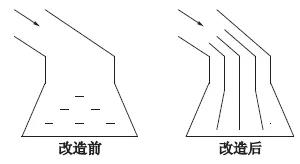5)將V型選粉機下料溜子改為四通道下料方式,保證物料在V型選粉機內(nèi)部形成均勻料幕(見圖3),提高選粉效果,預粉磨系統(tǒng)成品物料比表面積可提高到190m2/kg以上。