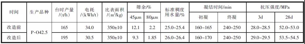 從表3可以看出,改造后生產(chǎn)P·O42.5水泥時磨機臺時產(chǎn)量提高30t/h,電耗降低3.5kWh/t,細度明顯變細,水泥標準稠度用水量增加,強度提高1~1.5MPa,增產(chǎn)節(jié)能效果顯著。