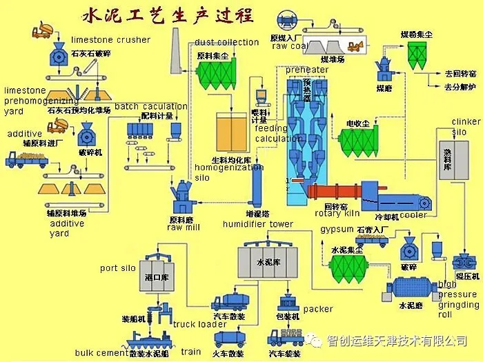 4.生產(chǎn)工藝:硅酸鹽水泥生產(chǎn)的大體步驟是:先把幾種原材料按適當(dāng)?shù)谋壤浜虾煤笤谀C中磨成生料;然后將制得的生料入窯進(jìn)行煅燒;再把燒好的熟料配以適當(dāng)?shù)氖啵ê突旌喜牧希┰谀C中磨成細(xì)粉,即得水泥。硅酸鹽系水泥的生產(chǎn)概括起來就是“兩磨一燒”。生料制備:石灰質(zhì)原料,粘土質(zhì)原料與少量校正原料經(jīng)破碎后,按一定比例配合、磨細(xì),并配合為成分合適,質(zhì)量均勻的生料熟料煅燒:生料在水泥窯內(nèi)煅燒至部分熔融所得以硅酸鈣為主要成分的硅酸鹽水泥熟料水泥粉磨:熟料加適量石膏,有時還加適量混合材料或外加劑共同磨細(xì)為水泥生產(chǎn)方法①干法生產(chǎn) 將原料同時烘干并粉磨,或先烘干經(jīng)粉磨成生料粉后喂入干法窯內(nèi)煅燒成熟料的方法。但也有將生料粉加入適量水制成生料球,送入立波爾窯內(nèi)煅燒成熟料的方法,稱之為半干法,仍屬干法生產(chǎn)之一種。②濕法生產(chǎn) 將原料加水粉磨成生料漿后,喂入濕法窯煅燒成熟料的方法。也有將濕法制備的生料漿脫水后,制成生料塊入窯煅燒成熟料的方法,稱為半濕法,仍屬濕法生產(chǎn)之一種。 干法和濕法生產(chǎn)特點①干法生產(chǎn)特點:干法是將生料粉直接送入窯內(nèi)煅燒,入窯生料的含水率一般僅1%~2%,省去了烘干生料所需的大量熱量。不僅可以制備出質(zhì)量均勻的生料而且逐步向大型方向發(fā)展。現(xiàn)在將懸浮預(yù)熱和預(yù)分解窯統(tǒng)稱為新型干法窯,它們成為干法生產(chǎn)今后發(fā)展的方向。②濕法生產(chǎn)特點:將生料制成含水32%一36%的料漿,在回轉(zhuǎn)窯內(nèi)將生料漿烘干并燒成熟料。濕法制備料漿,粉磨能耗較低,約低30%,料漿容易混勻,生料成分穩(wěn)定,有利于燒出高質(zhì)量的熟料。但球磨機易磨件的鋼材消耗大,熟料出窯溫度較低,不宜燒高硅酸率和高鋁氧率的熟料。