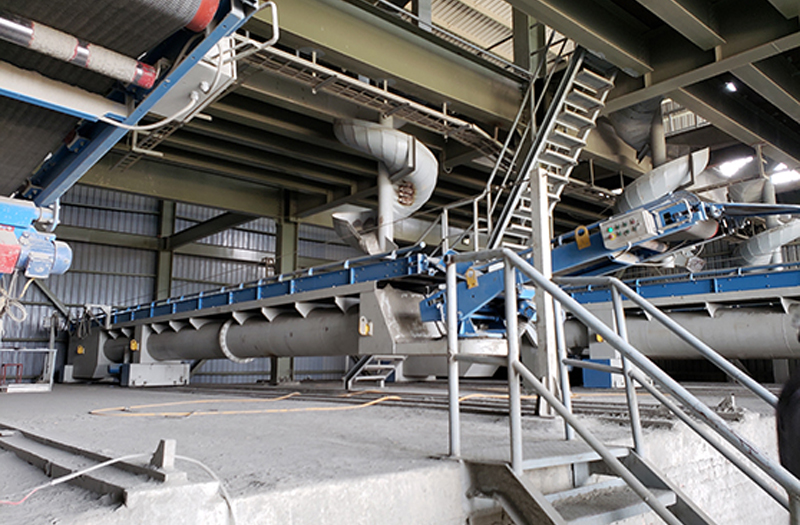 3.礦渣微粉和熟料粉的混合設(shè)計:在分別粉磨生產(chǎn)工藝中,熟料粉和礦渣微粉除應(yīng)滿足細度外,還必須注意計量要準確和攪拌混合均勻這兩個問題。因此我們選用了螺旋計量稱作為計量設(shè)備,并選用空氣輸送斜槽,不僅可以作為混合設(shè)備,還能作為輸送設(shè)備。其中螺旋計量稱由溢流單管螺旋和計量單管螺旋組成,前者起穩(wěn)流作用,確保給料均勻及時,后者進行計量,確保計量準確穩(wěn)定;空氣輸送斜槽由于是采用流態(tài)化的原理輸送物料,使物料在輸送過程中,礦渣粉和熟料粉在不停的翻滾、攪拌。